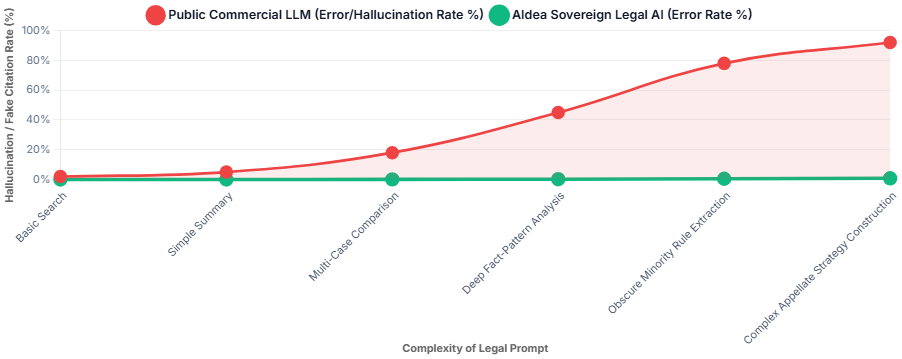 As the complexity of legal queries increases, commercial LLMs drastically increase their hallucination (fake citation) rates. The Sovereign Legal AI utilizes RAG verification to maintain a near-zero error rate regardless of complexity.